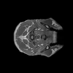 Figure 5. A T1-weighted image, rendered one slice at a time. The anatomical structures in the head and neck as well as the shape of the white and gray matter of the cerebral cortex are clear due to the contrast differences in the tissues.#